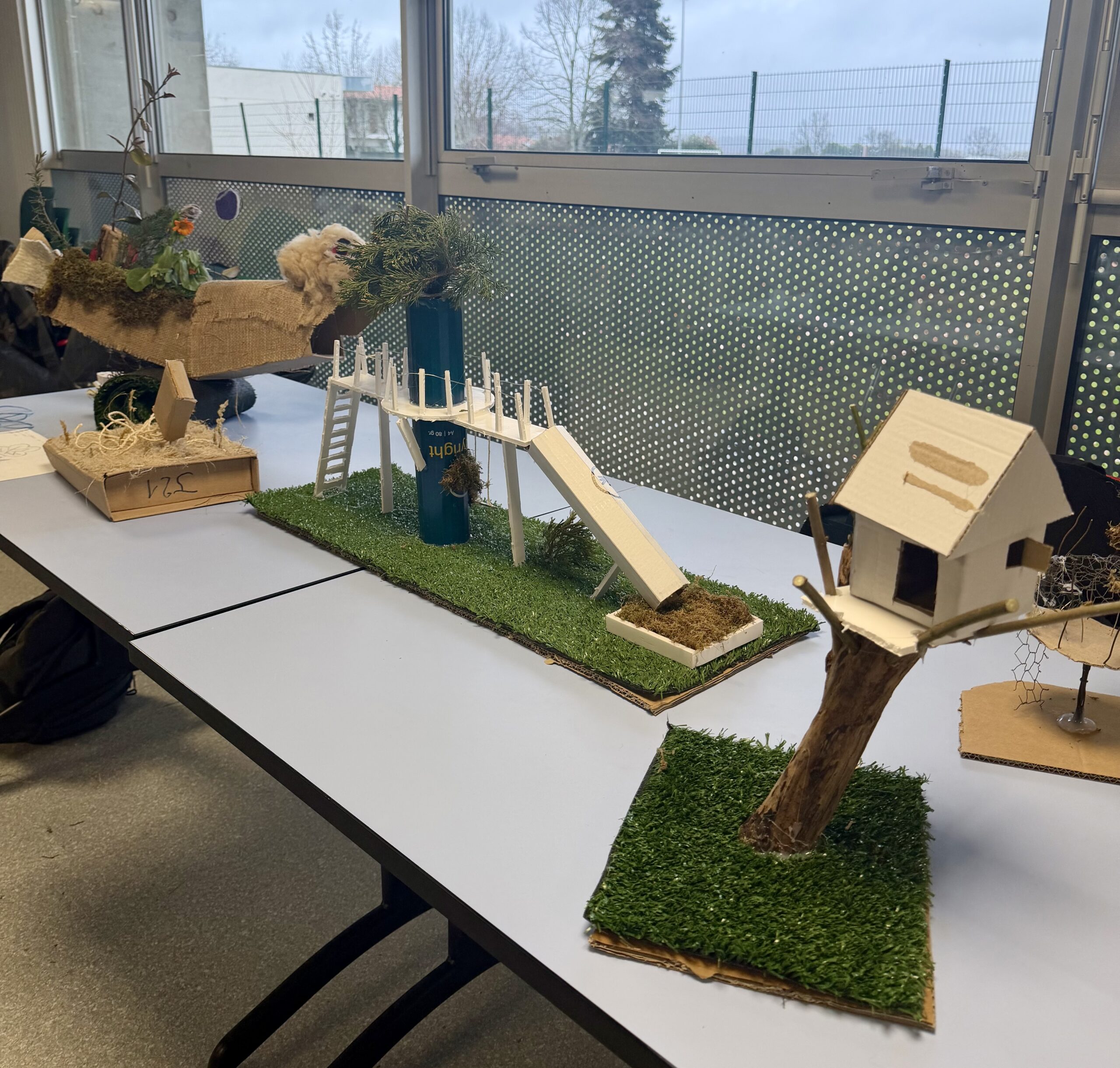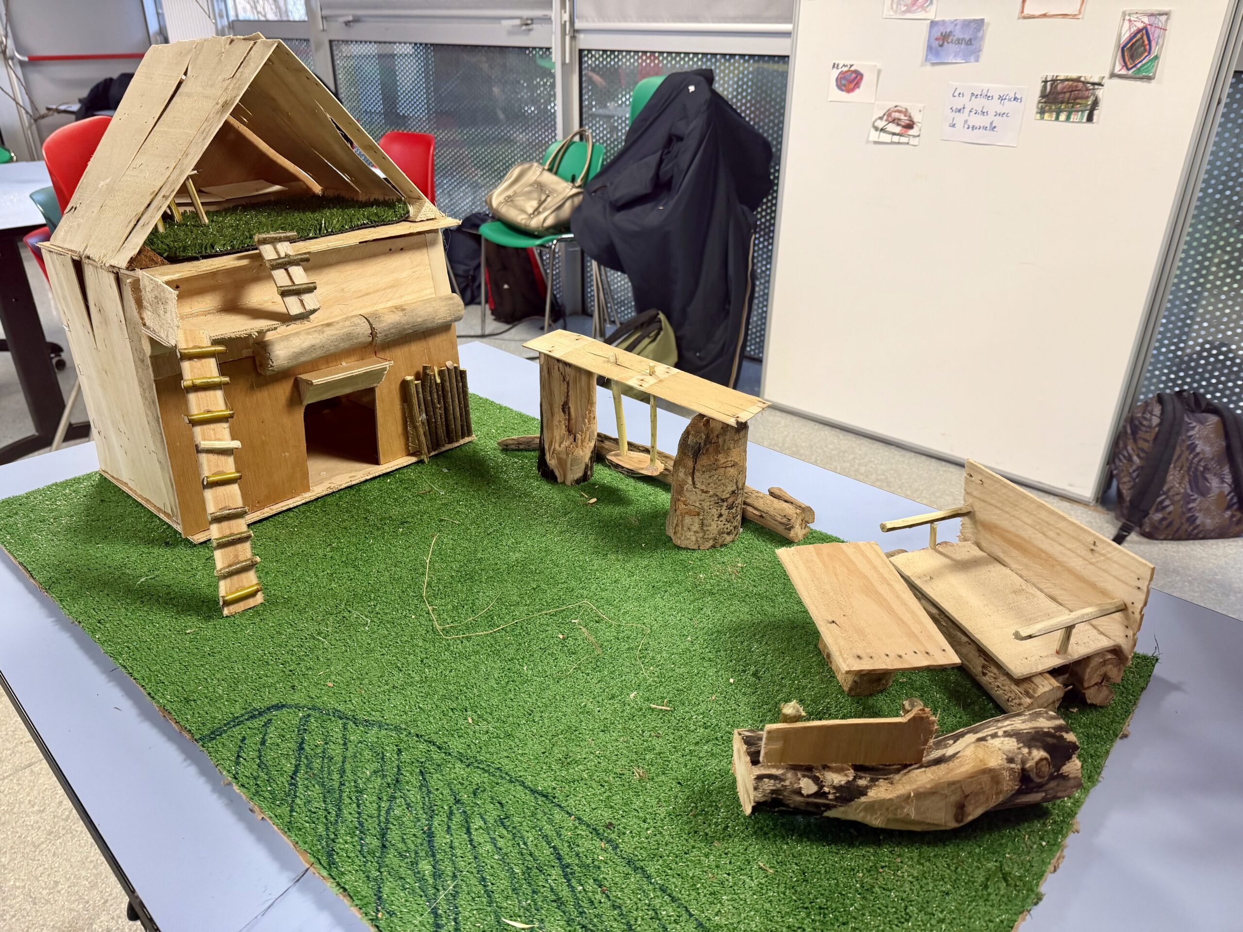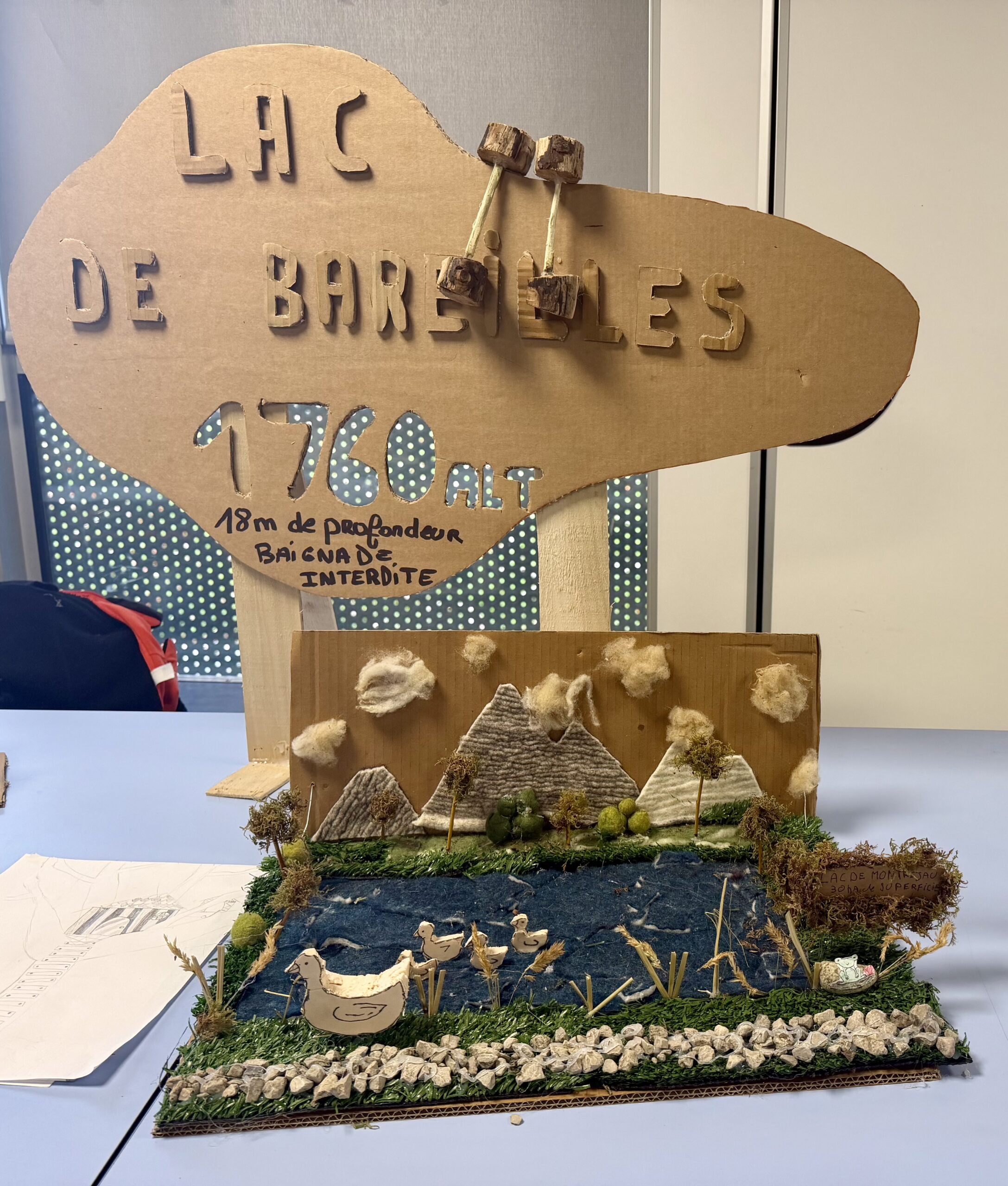 Comme une petite exposition, les maquettes ont été présentées avec les explications des élèves. On a pu découvrir des canards inspirés par le lac de Montréjeau, réalisés en laine, gravier et foin, un potager XXL construit à partir de fil de fer, de polystyrène et de laine, une cabane de berger suspendue dans un arbre, ou encore un cochon mêlant polystyrène, foin et bois.