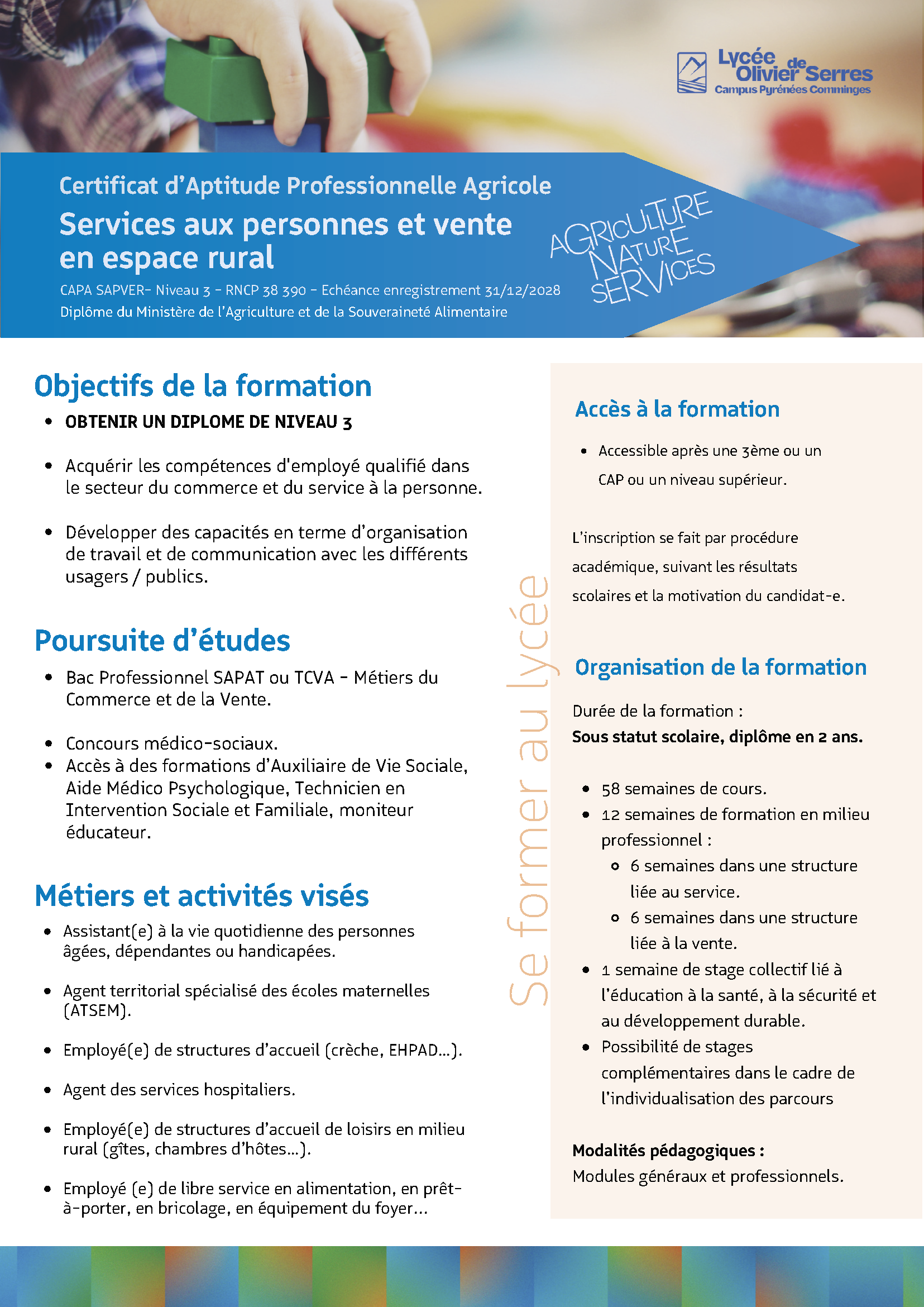 Le CAP agricole SAPVER – Services Aux Personnes et Vente en Espace Rural et le bac pro SAPAT – Services Aux Personnes Et Aux Territoires.